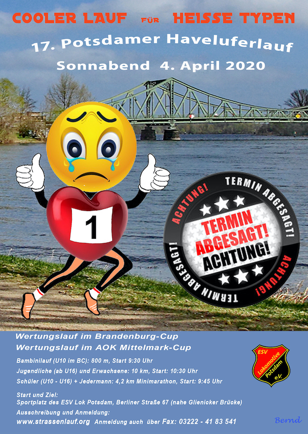 aufgrund der geringen Zahl der bisher vorangemeldeten Teilnehmer müssen wir eingedenk der hohen finanziellen und personellen Aufwendungen und der zusätzlich geforderten Coronamaßnahmen leider den für den 26. September geplanten Haveluferlauf absagen.